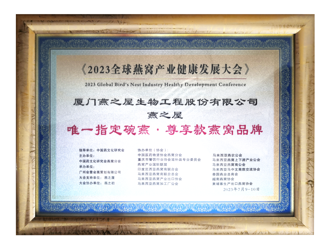 圖:燕之屋獲2023 全球燕窩產(chǎn)業(yè)健康發(fā)展大會(huì)支持單位牌匾
