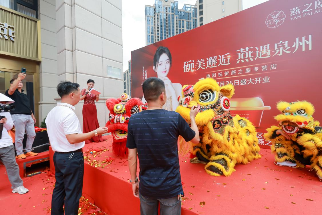 致辭結(jié)束后,現(xiàn)場領(lǐng)導(dǎo)與嘉賓上臺剪彩,一同剪下手中的紅色綢帶,掀開燕之屋泉州中駿天峰店的全新篇章和美好愿景。一時間,禮炮升空、彩帶飄揚,燕之屋泉州中駿天峰店老板曾壽洪為開業(yè)雄獅點睛、采青,一點天庭,福星高照,二點眼睛,眼觀六路、鵬程萬里,在點睛之筆下,雄獅時而搖頭擺尾、時而高高躍起,為燕之屋泉州中駿天峰店獻(xiàn)上“生意興隆、開業(yè)大吉”的祝福。