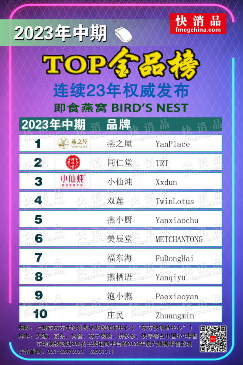 《快消品》發(fā)布“2023年中期線上TOP金品榜”,燕之屋奪得即食燕窩品類冠軍