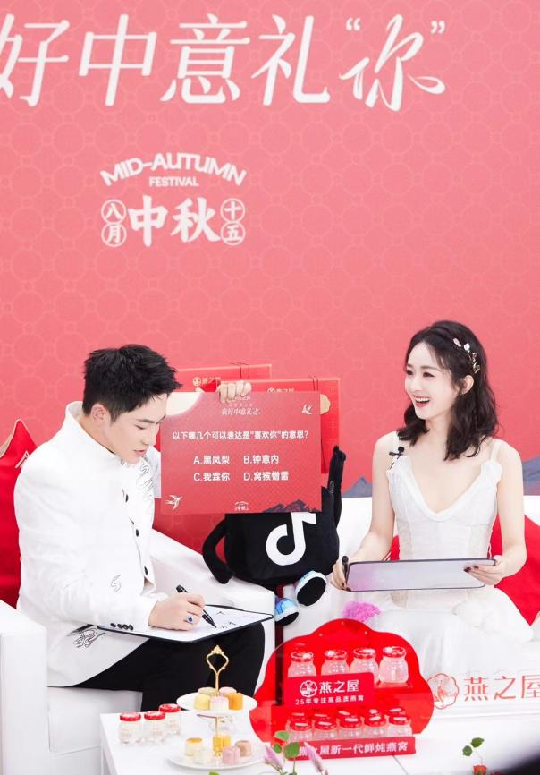 中秋猜燈謎,是中國傳統(tǒng)民俗。直播間里,趙麗穎與主持人提前過中秋,上演了一場別開生面的燈謎游戲,主持人輪番舉起印有“Emoji語言”的畫板,趙麗穎巧妙作答,面對最后一道難題,趙麗穎笑言“好難”,隨后在主持人的提醒下,道出“送你燕之屋”的正確答案,從“花好月圓”、“嫦娥奔月”到“送你燕之屋”,滿屏中秋美詞將直播間的過節(jié)氛圍拉滿。隨著直播間氣氛漸入佳境,主持人攜趙麗穎在線開啟抽獎模式,粉絲評論“健康大牌日、中秋中意禮”,即有機會獲得燕之屋中秋定制月餅。