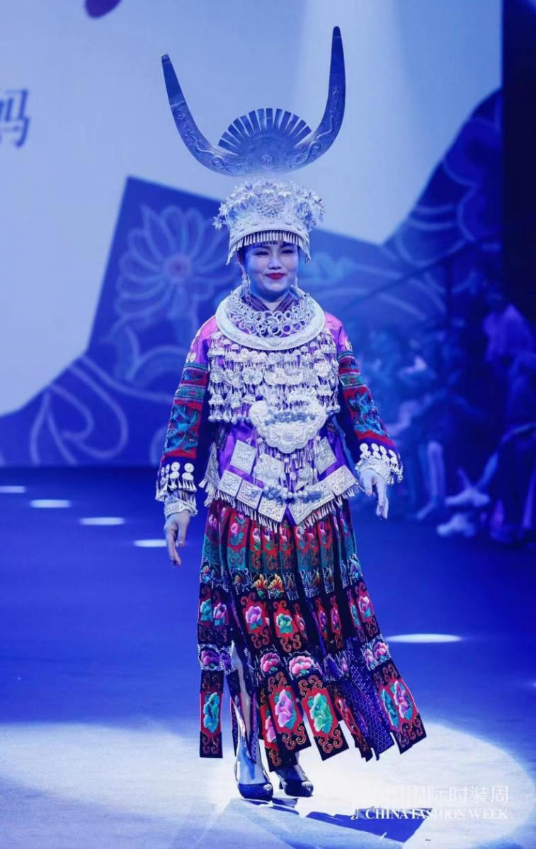 圖:燕之屋“天才媽媽”貴州苗繡工坊主理人劉英登上中國國際時裝周走秀舞臺