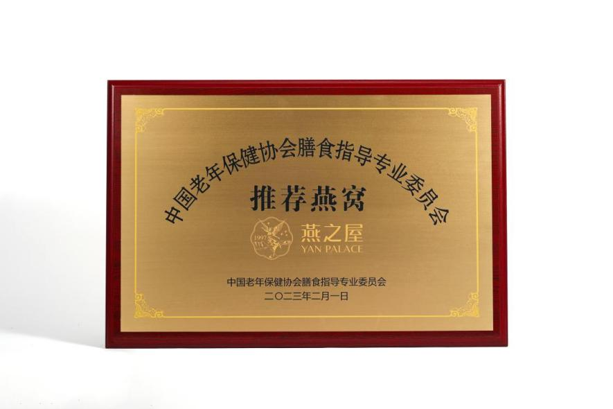 圖:燕之屋榮獲中國老年保健協(xié)會(huì)膳食指導(dǎo)專業(yè)委員會(huì)推薦燕窩榮譽(yù)牌匾、