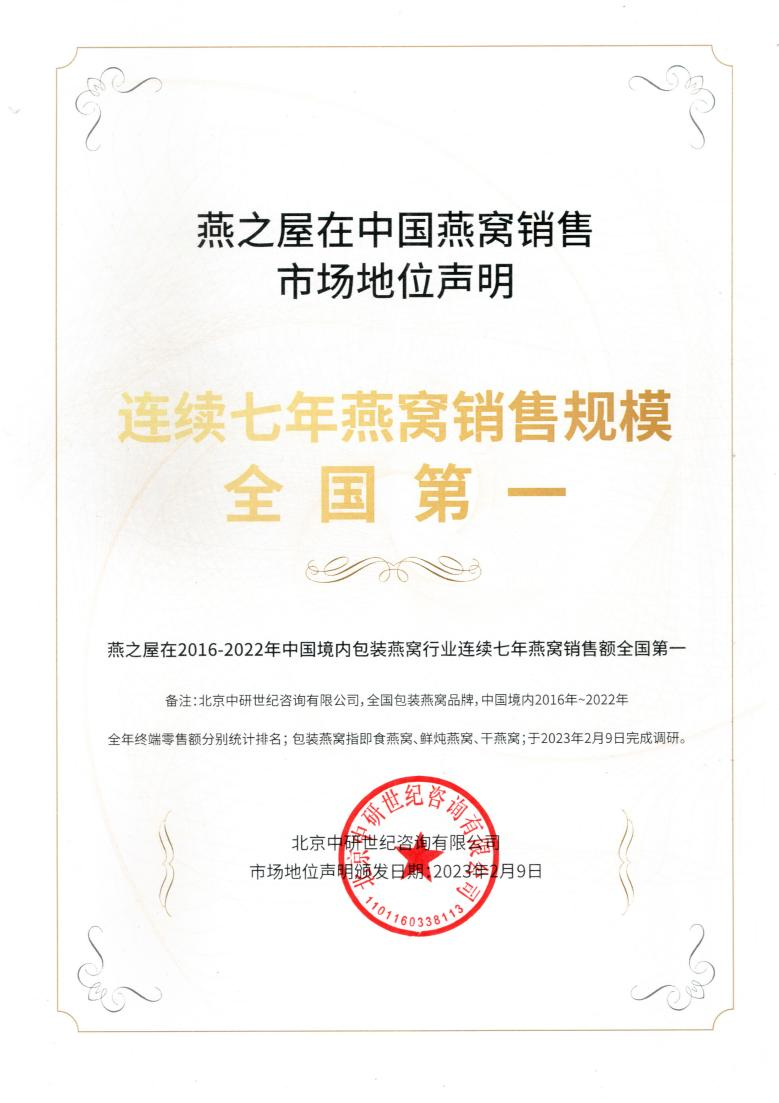圖:燕之屋在2016-2022年中國境內(nèi)包裝燕窩行業(yè)連續(xù)七年燕窩銷售額全國第一