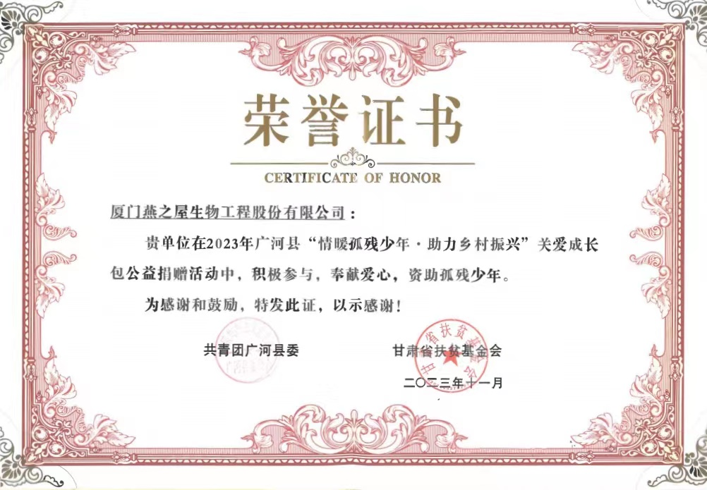 圖:燕之屋榮獲廣河縣“情暖孤殘少年·助力鄉(xiāng)村振興”關(guān)愛成長包公益捐贈(zèng)活動(dòng)榮譽(yù)證書