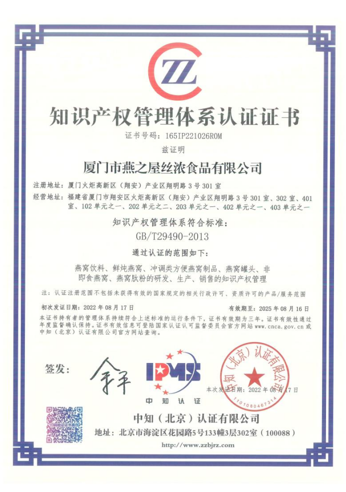此外,2022年6月,燕之屋成立“知識(shí)產(chǎn)權(quán)管理小組”,深入實(shí)施知識(shí)產(chǎn)權(quán)強(qiáng)企戰(zhàn)略。同年8月,燕之屋通過(guò)前期的知識(shí)產(chǎn)權(quán)管理現(xiàn)狀診斷、構(gòu)建知識(shí)產(chǎn)權(quán)管理體系,并通過(guò)內(nèi)部自查調(diào)整、經(jīng)過(guò)內(nèi)審會(huì)議以及管理評(píng)審不斷進(jìn)行完善體系,最終由中知(北京)認(rèn)證有限公司對(duì)燕之屋主體進(jìn)行外部現(xiàn)場(chǎng)審核認(rèn)證,順利通過(guò)國(guó)標(biāo)《企業(yè)知識(shí)產(chǎn)權(quán)管理規(guī)范》(GB/T29490-2013)的貫標(biāo)認(rèn)證,獲得知識(shí)產(chǎn)權(quán)管理體系認(rèn)證證書,標(biāo)志著燕之屋在知識(shí)產(chǎn)權(quán)規(guī)范化管理、知識(shí)產(chǎn)權(quán)運(yùn)用、知識(shí)產(chǎn)權(quán)保護(hù)等方面達(dá)到國(guó)內(nèi)燕窩行業(yè)前沿水平。今年1月,國(guó)家知識(shí)產(chǎn)權(quán)局公布2023年度國(guó)家知識(shí)產(chǎn)權(quán)優(yōu)勢(shì)企業(yè)評(píng)定結(jié)果,燕之屋憑借行業(yè)內(nèi)先進(jìn)的研發(fā)創(chuàng)新實(shí)力、完備的知識(shí)產(chǎn)權(quán)管理體系以及突出的知識(shí)產(chǎn)權(quán)管理水平,成功榮獲“國(guó)家知識(shí)產(chǎn)權(quán)優(yōu)勢(shì)企業(yè)”稱號(hào),自主知識(shí)產(chǎn)權(quán)能力贏得權(quán)威認(rèn)可。